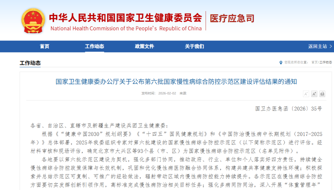 2月2日,国家卫生健康委办公厅发布《关于公布第六批国家慢性病综合防控示范区建设评估结果的通知》。